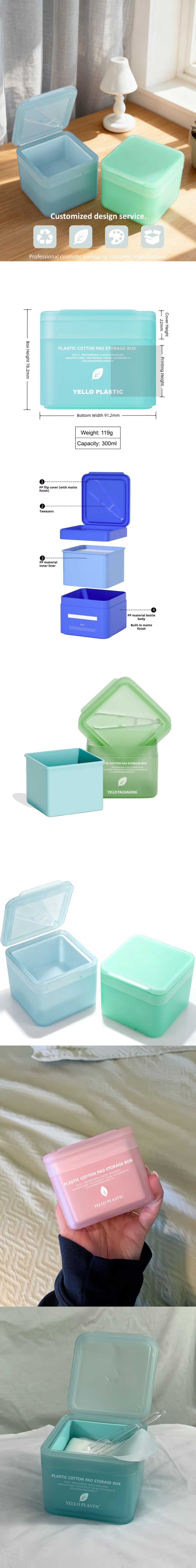 • Custom 300ml PP Plastic Cosmetic Facial Toner Cotton Pad Jar Storage Box Skincare Container with Tweezers and Flip Lid