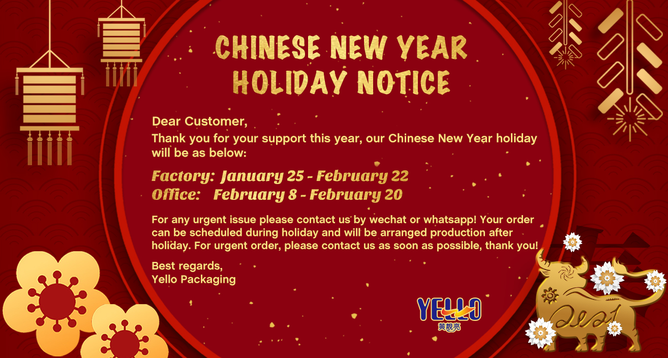 Thanks for your support this year, our Chinese New Year Holiday will be as below: