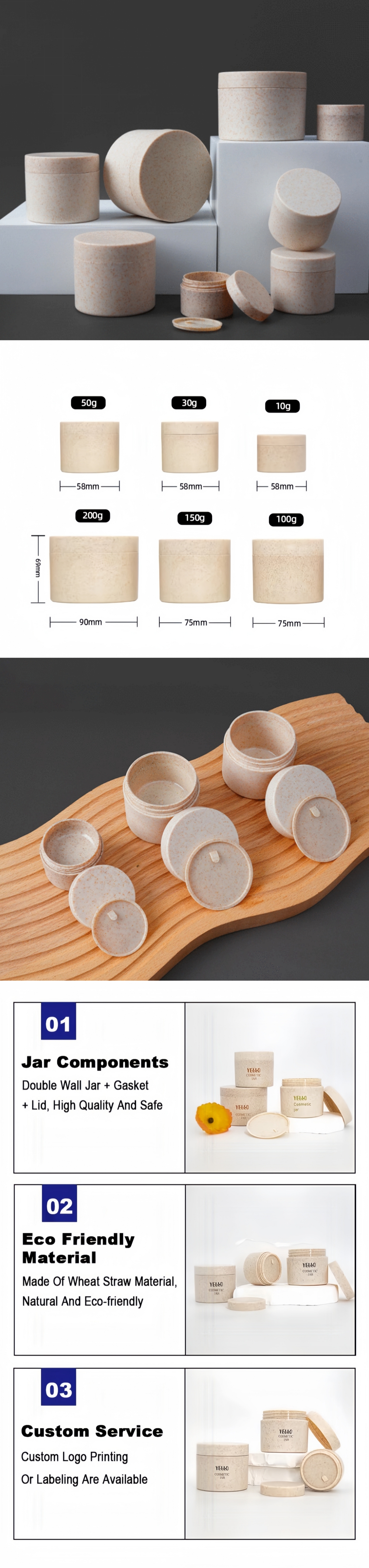 • Wholesale Custom Empty Eco-friendly Wheat Straw Cosmetic Cream Pots Jars Body Butter Containers With Lids for Face Cream Scrub Mask Packaging
